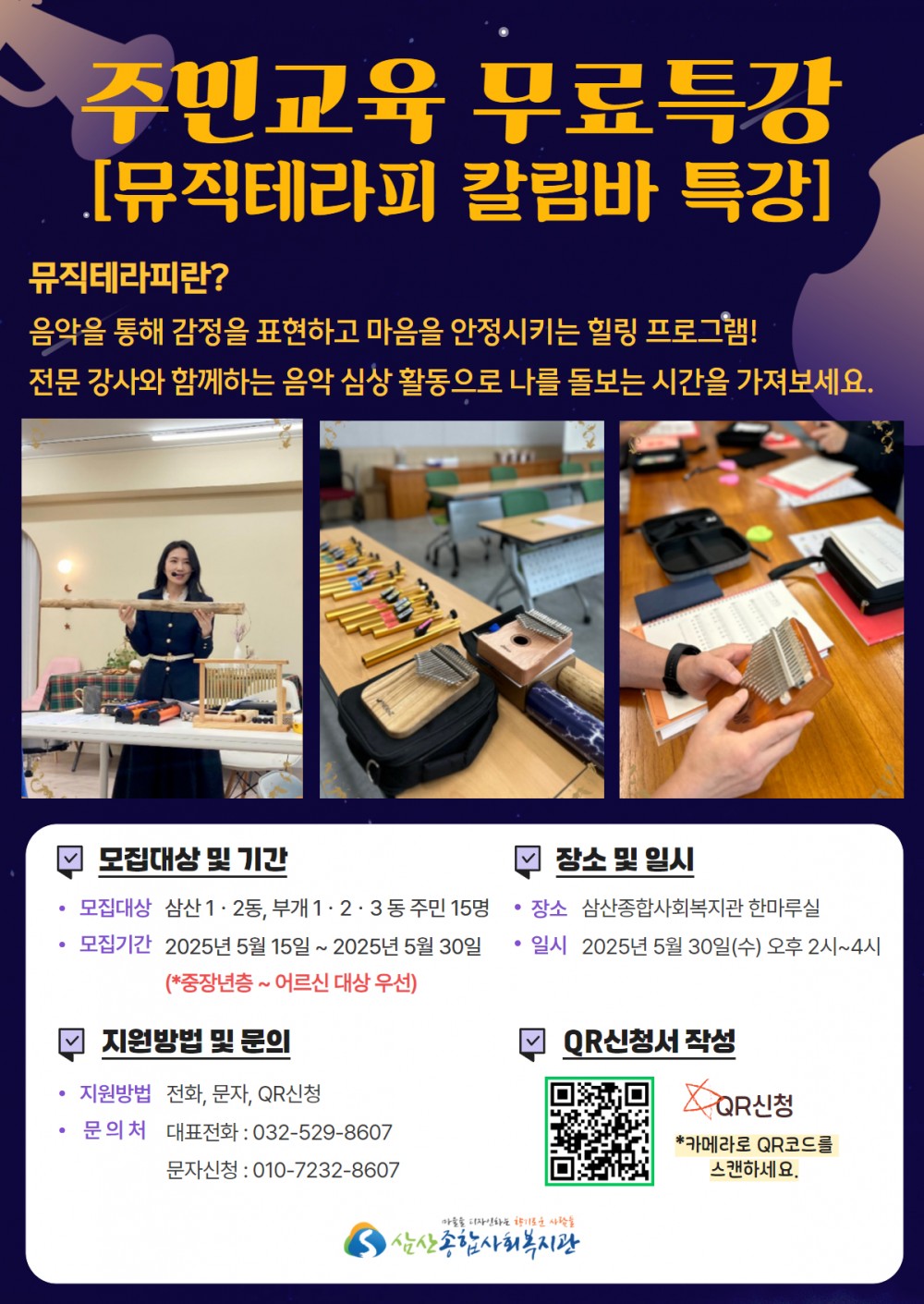 삼산종합사회복지관에서는 5월 주민교육으로 칼림바 뮤직테라피 특강을 진행합니다.