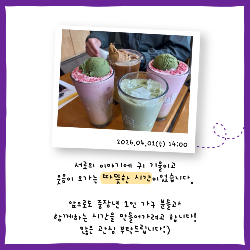 앞으로도 중장년 1인 가구 분들과 함께하는 시간을 만들어가려고 합니다.