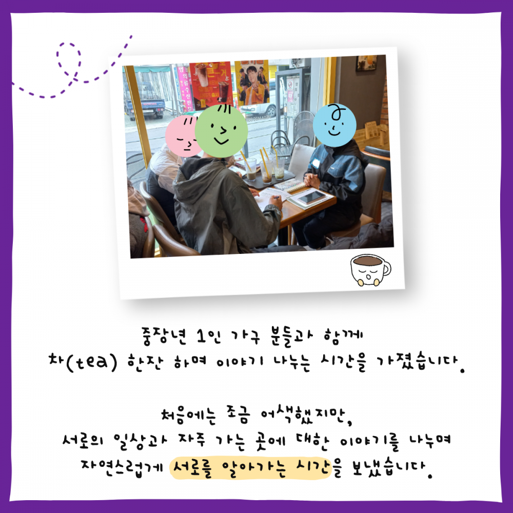 중장년 1인 가구 분들과 함께 차(tea) 한잔 하며 이야기 나누는 시간을 가졌습니다.
