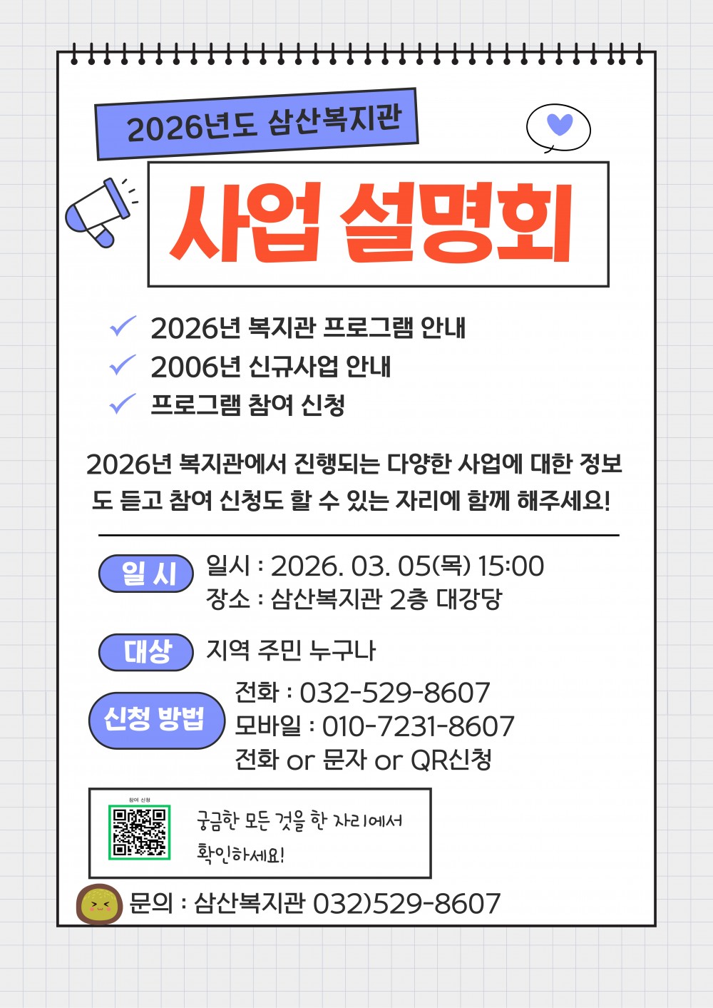 사업설명회를 2026년 3월 5일 목요일 오후3시 삼산복지관 2층 강당에서 진행합니다.