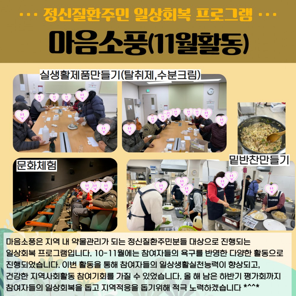 마음소풍은 지역 내 약물관리가 되는 정신질환주민분들 대상으로 진행되는