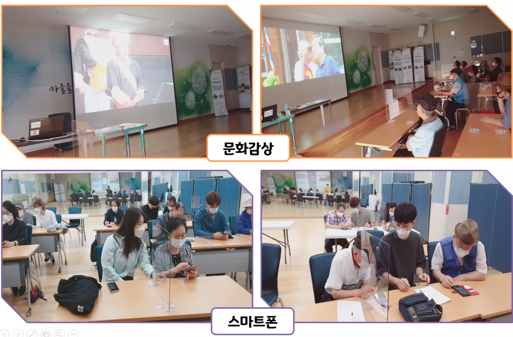 ‘스마트폰’의 경우 코로나로 인해 온택트 시대로 접어들면서 디지털 문맹으로 어려움을 겪는 어르신이 늘어남에 따라 시작하게 되었습니다. 특히 시대적 흐름에 따라 어르신들의 스마트폰 배움의 욕구가 늘면서 새로 가입한 어르신들이 많았습니다. “이제 손자에게 물어보지 않아도 당당하다.”, “배움에는 끝이 없다. 스마트폰 교육 덕분에 자신감을 되찾았다.”, “어렵기도 하지만 집에 가서 반복도 많이 해본다.” 등 배움의 즐거움과 열정이 느껴지는 피드백이 많았습니다.