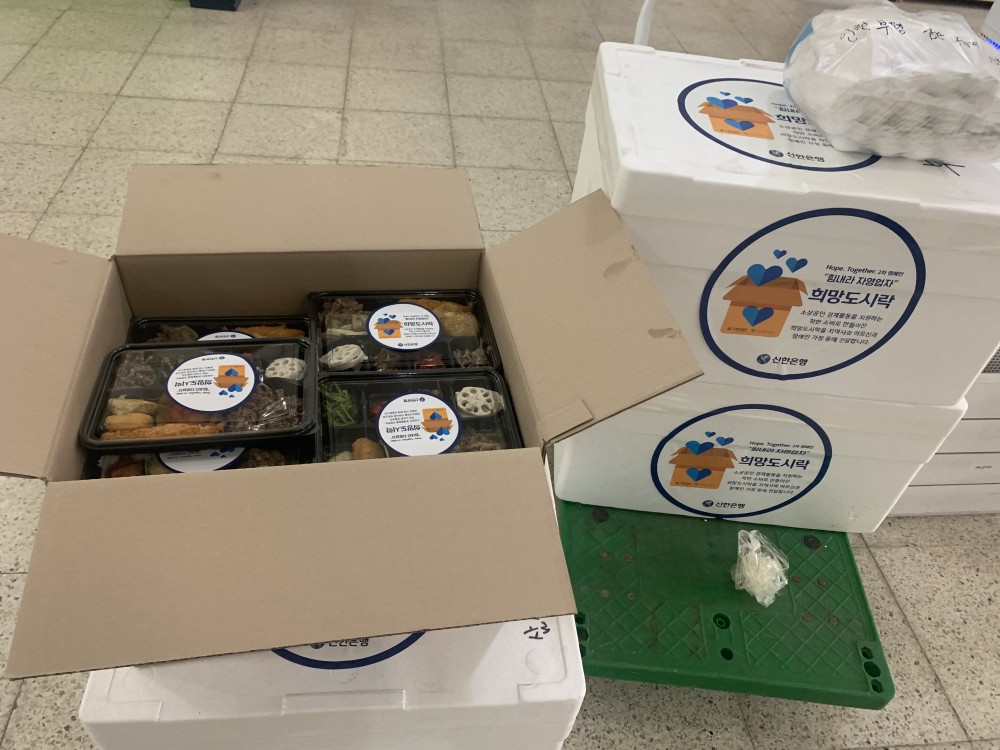 지역 내 소상공인은 돕고 지역경제 활성화를 위한 희망 도시락은 당일 오전에 업체에서 만들어진 도시락을 배분 할 수 있게 포장하여