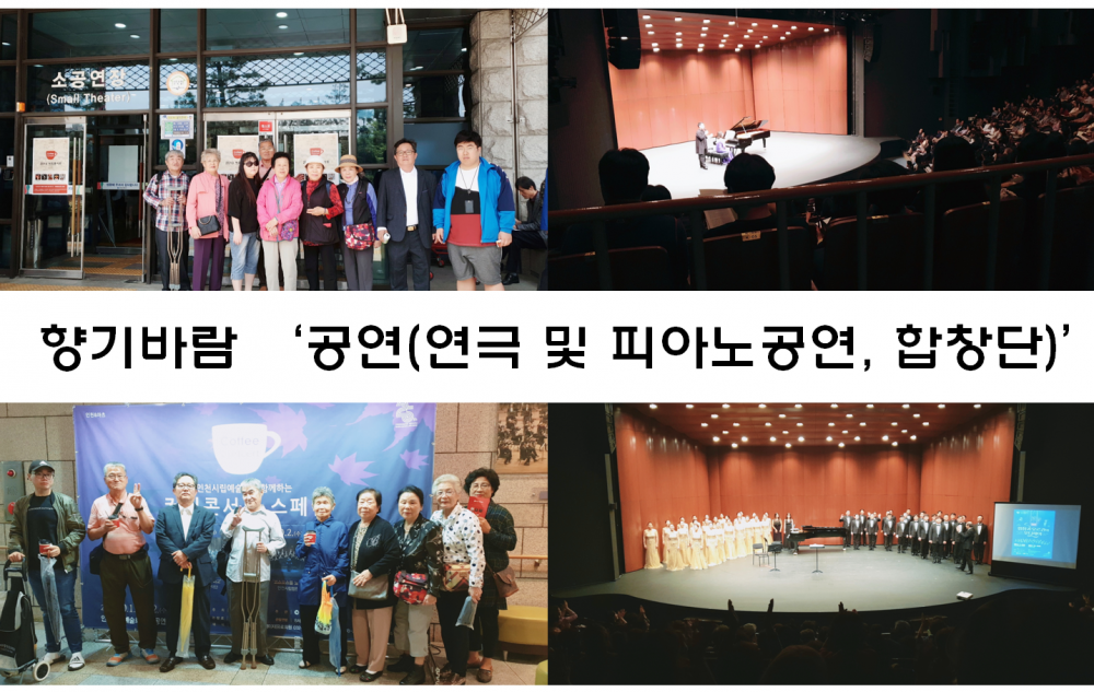 저희 향기바람에는 그동안 수많은 지역주민들과 함께 하였는데요. 참여자 대부분은 중년 남성, 독거노인 및 장애여성 등 다양한 계층이 참여하셨고 영화나 공연 및 공예체험, 아쿠아리움 관람, 합창단 공연 등 여러 가지 여가문화 활동을 진행하였습니다. 한 주민은 20년 넘게 영화를 본 적이 없다가 향기바람을 계기로 오랜만에 영화관 나들이를 다녀오셨다고 합니다. 또 한 어르신은 태어나 처음으로 합창단 공연을 보면서 옛 추억에 잠겨 눈물을 흘리시기도 하였습니다. 담당자로서 하나 느낀 점은 활동 전과 후의 주민들의 표정변화인데요. 더 많이 웃고 밝은 모습으로 문화체험활동 소감을 들을 때마다 담당자로서 더 큰 힘이 생깁니다. 외부에서만 진행되다보니 여러 가지 우여곡절도 많았지만 문화예술이라는 커다란 테두리 안에서 주민들과 폭넓은 소통의 장이 열릴 수 있었습니다. 문화 체험 기회를 제공하고 잊지 못할 추억을 선사해드린 향기바람은 앞으로도 더 많은 이야기로 찾아뵙겠습니다. ^^