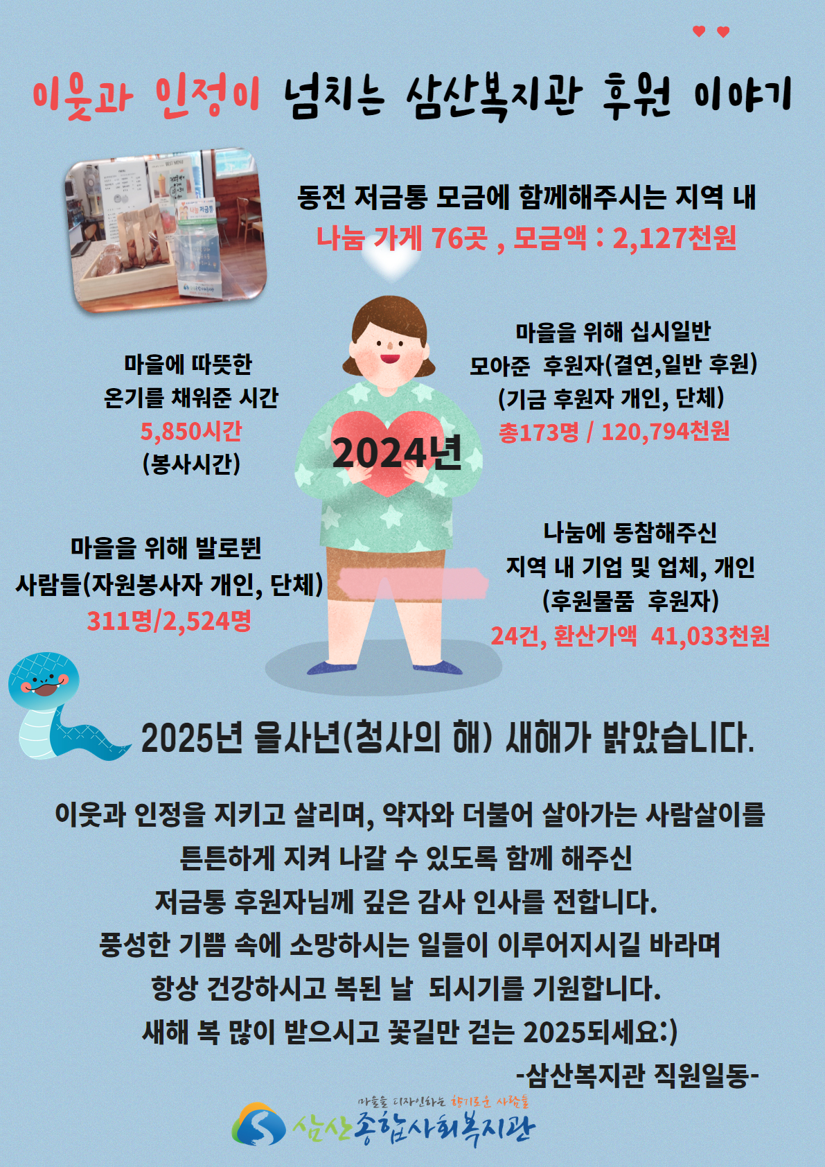 2025년 을사년(청사의 해) 새해 이웃과 인정을 지키고 살리며, 약자와 더불어 살아가는 사람살이를 튼튼하게 지켜 나갈 수 있도록 함께 해주신 저금통 후원자님께 깊은 감사 인사를 전합니다.