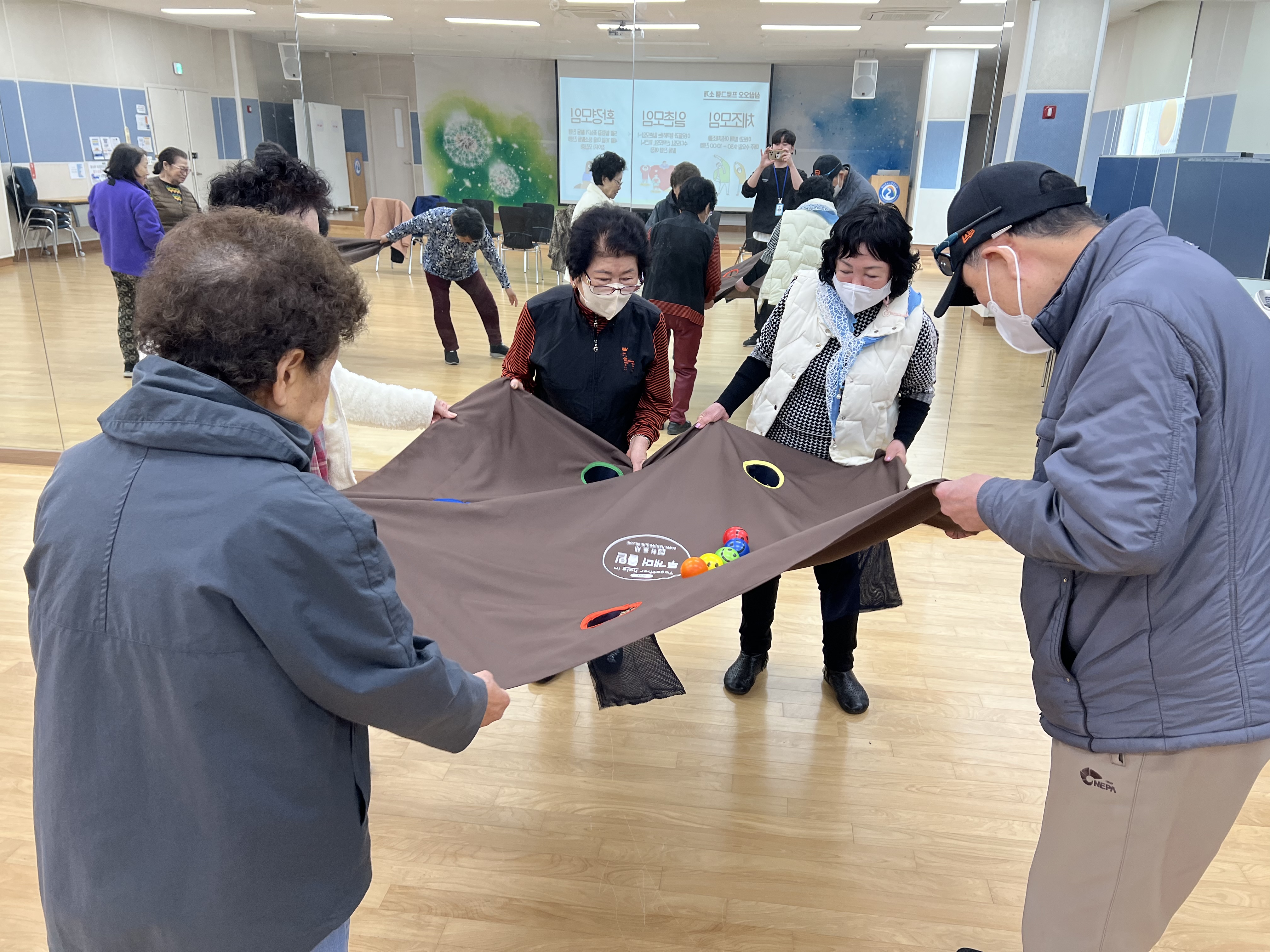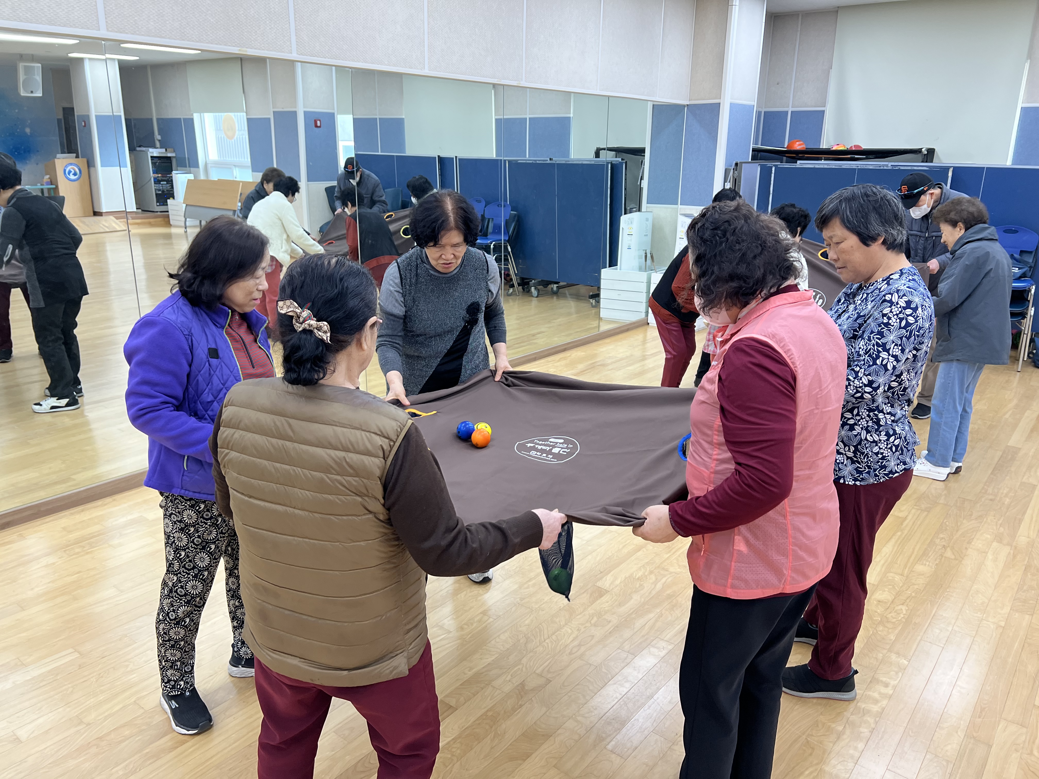 참여자들이 두 팀으로 나뉘어 큰 천의 모서리를 잡고,