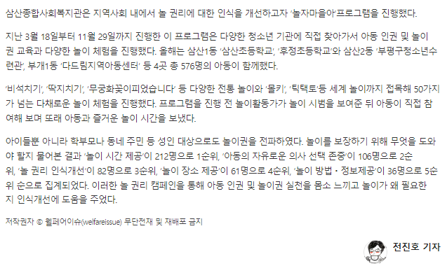[보도자료 - 웰페어뉴스] 삼산종합사회복지관 아동 '놀 권리' 인식개선 '놀자마을아' 진행