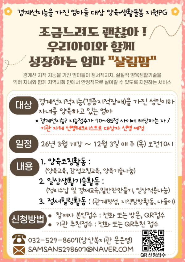 [인천 2/19(목)~] 부평 삼산복지관 경계선지능 엄마 지원 '살림맘' 모집