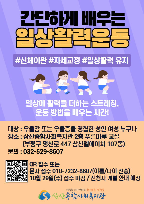 일상에 활력을 더하는 스트레칭, 운동 방법을 배우는 시간! 일상활력운동 특강을 진행합니다.