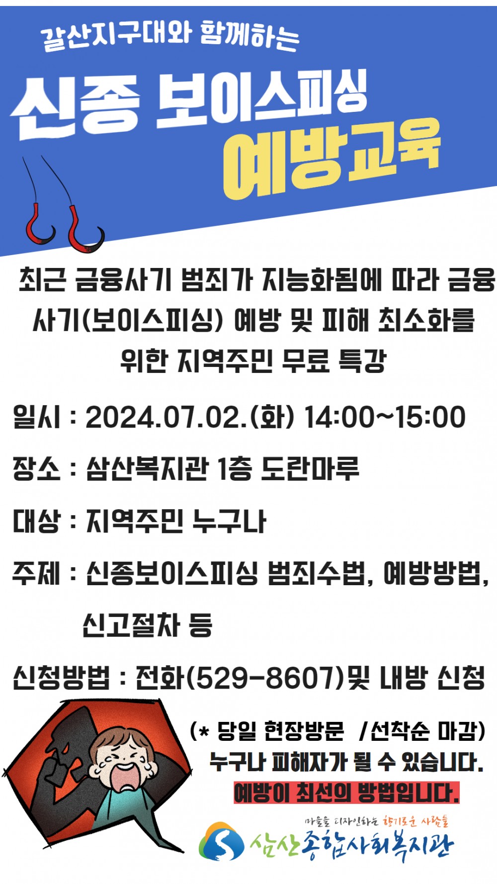 7월 주민교육 특강으로는 갈산지구대와 함께 신종보이스피싱 교육을 준비했습니다.
