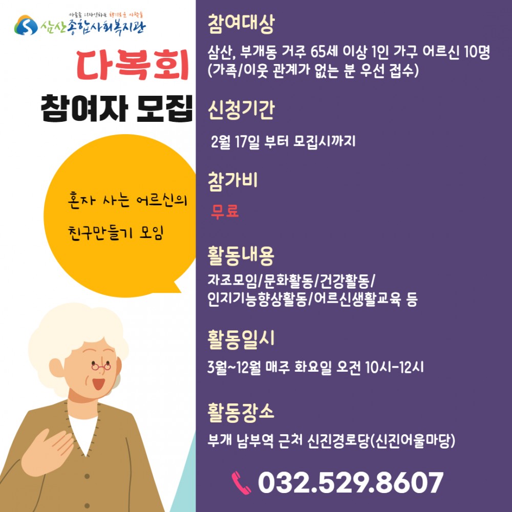 삼산복지관에서는 '혼자사는 65세 이상 어르신들의 친구만들기 모임' ★다복회★를 진행합니다.