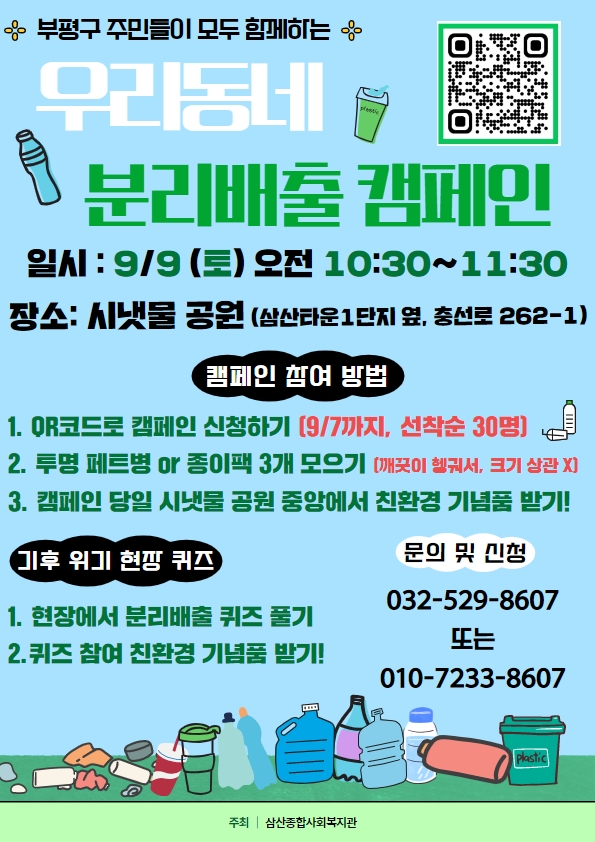 9/9(토) 10:30~11:30 '시냇물공원'(충선로262-1, 삼산타운1단지 맞은편 & 두산위브아파트 옆)에 방문해서 친환경 기념품도 받고 분리배출 지식도 얻어가세요:)!