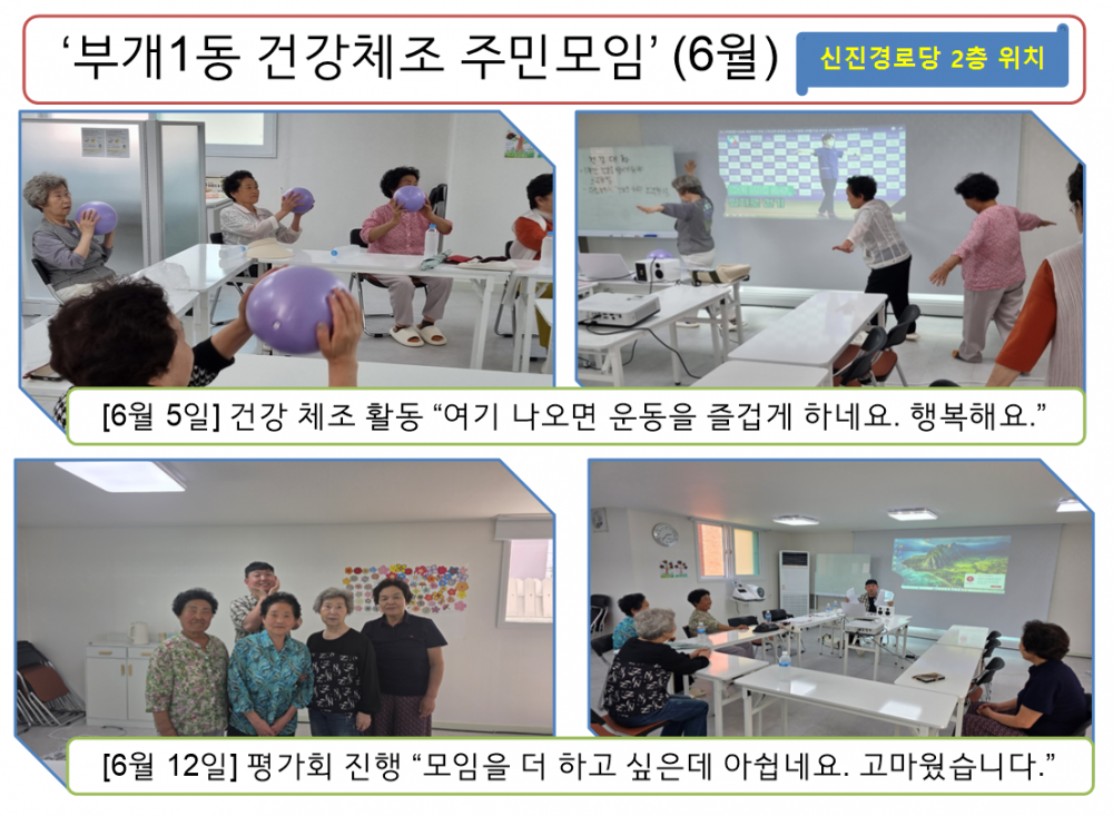 다양한 체조 활동을 진행하였고 6월 12일 자로 평가회 진행 후 마무리하였습니다. 건강 유지와 더불어 이웃관계를 살리는 데에 큰 도움을 주었습니다.