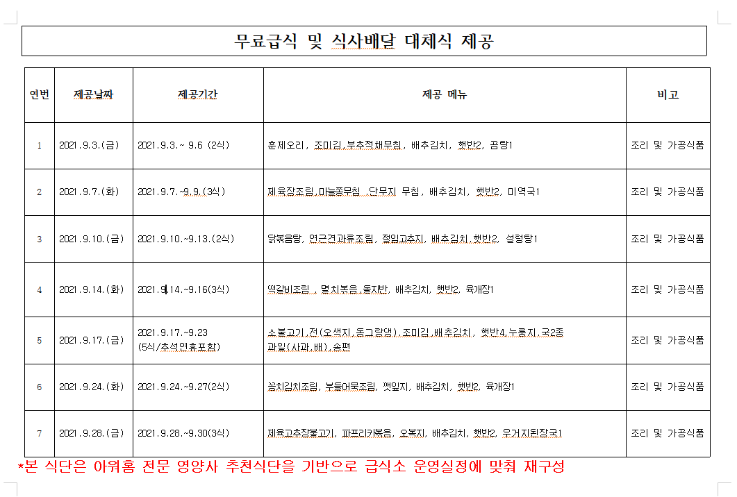 무료급식및 식사배달 9월 메뉴
