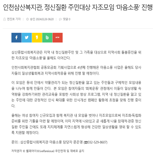 인천삼산복지관, 정신질환 주민대상 자조모임 ‘마음소풍’ 진행 - 웰페어이슈(welfareissue)