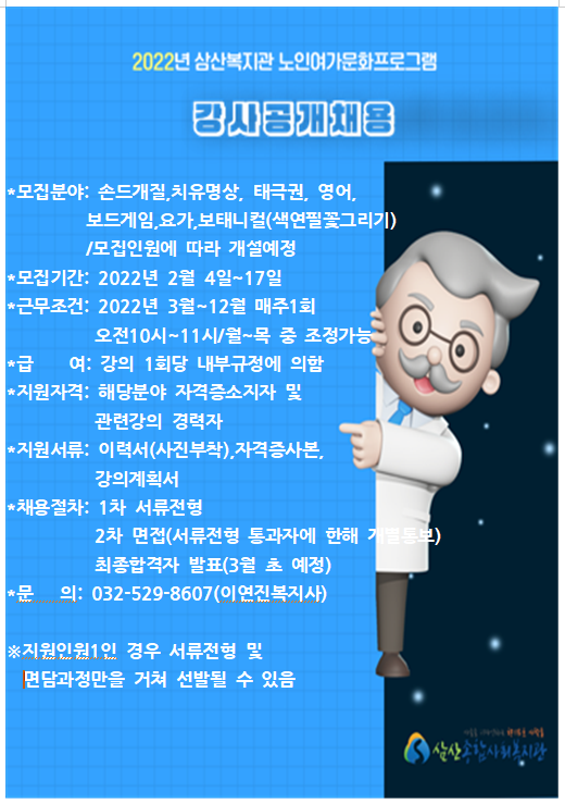 삼산종합사회복지관에서는 지역 내 어르신의 행복한 노후 생활을 위한 노인여가문화활동 프로그램 청춘대학2’ 강사를 다음과 같이 모집하고자 하오니 많은 지원 바랍니다