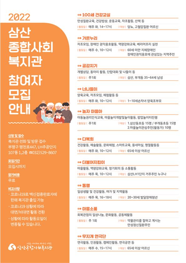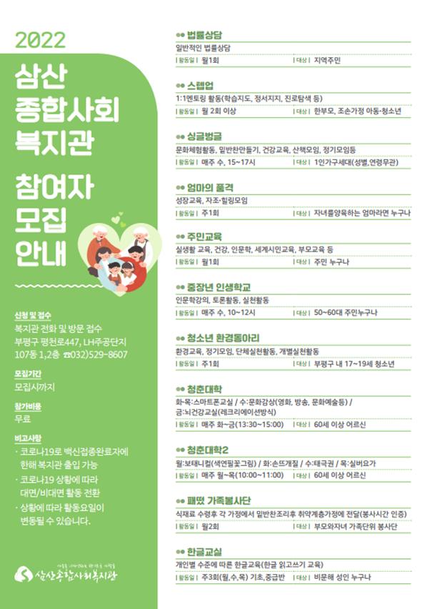문의 및 신청 : 032-529-8607(삼산복지관)