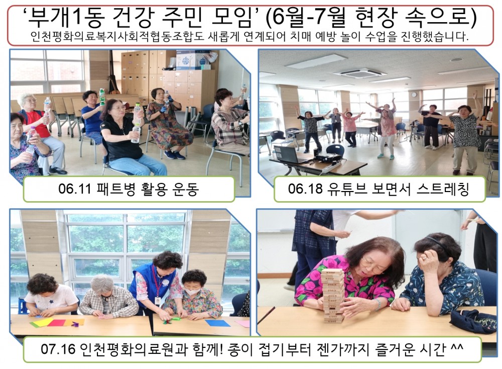 - 부개1동 지역주민들의 '건강'을 챙기고 새로운 이웃 관계를 맺는 주민 모임입니다. 인천평화의료원도 함께 동참해주셨습니다.