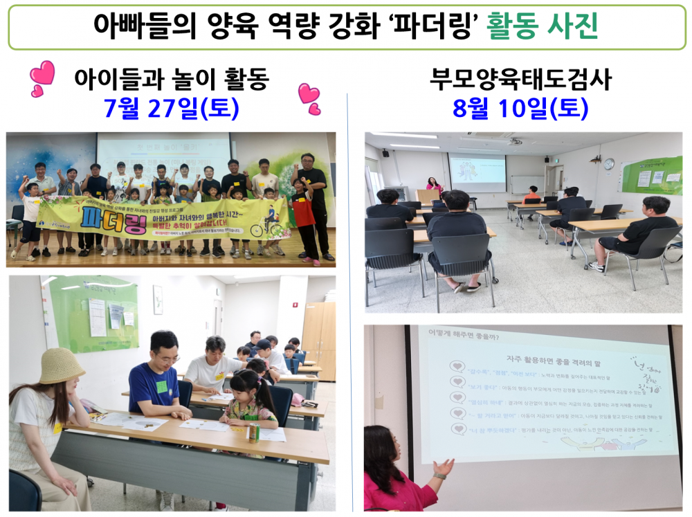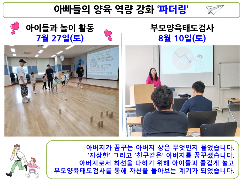 내용 : 파더링? 뜻을 혹시 아시나요? 아버지로서 자녀를 양육하다, 아버지 노릇하다라는 뜻이 있습니다. 이처럼 파더링은 아버지의 양육 방법을 알려주고 자녀와 친해질 수 있는 프로그램입니다.