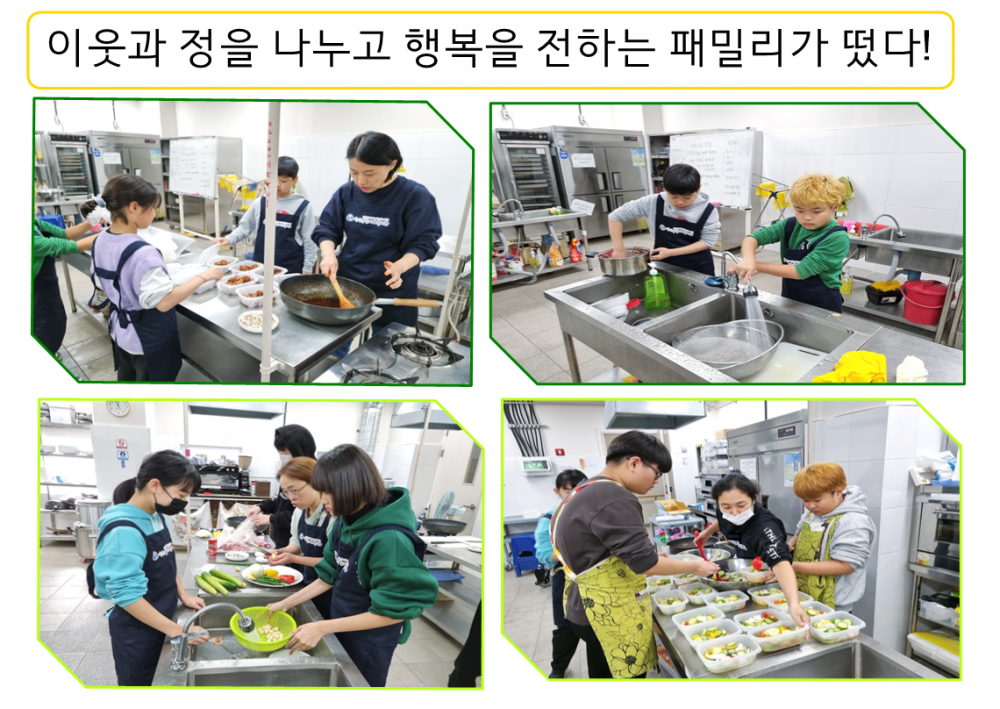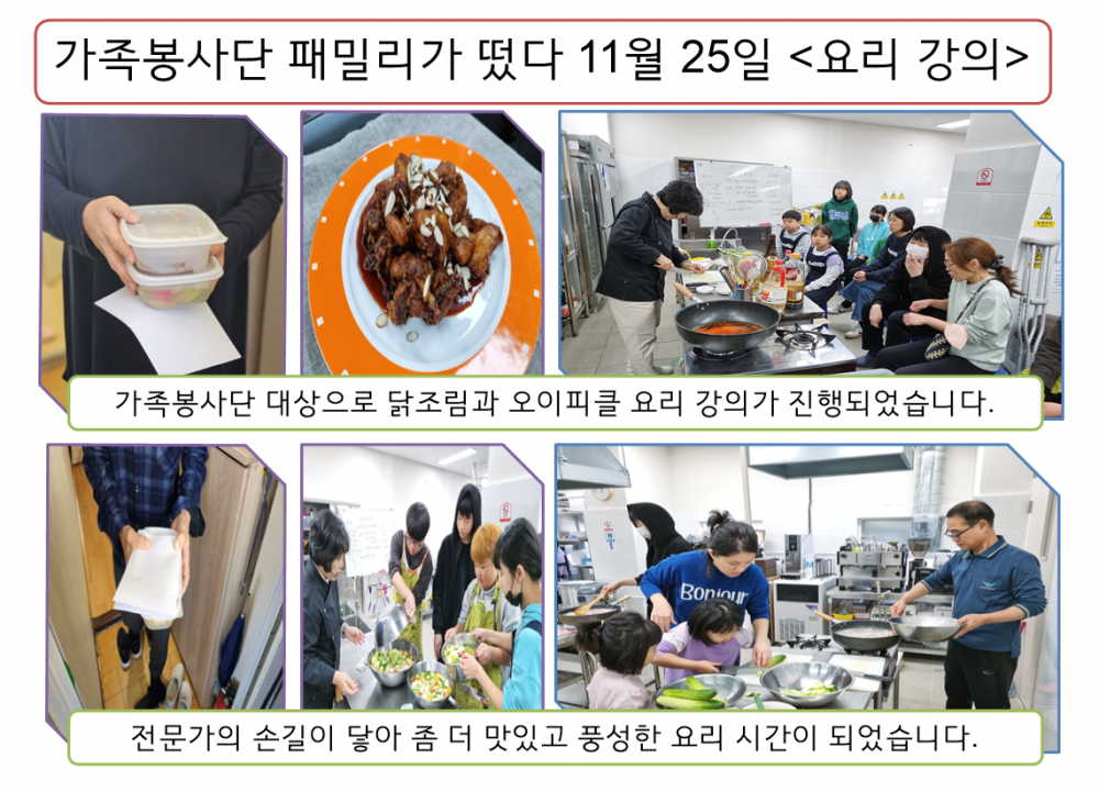 - 내용 : 가족봉사단의 요리 실력을 키워서 질 좋은 반찬을 제공하고자 요리 강의를 진행하였습니다. 요리 강의를 진행하면서 전문가에게 요리를 제대로 배워보고 이용자에게도 질 좋은 밑반찬을 배달 가니까 만족스럽다, 즐겁다, 보람차다 등의 긍정적인 피드백이 많았습니다.