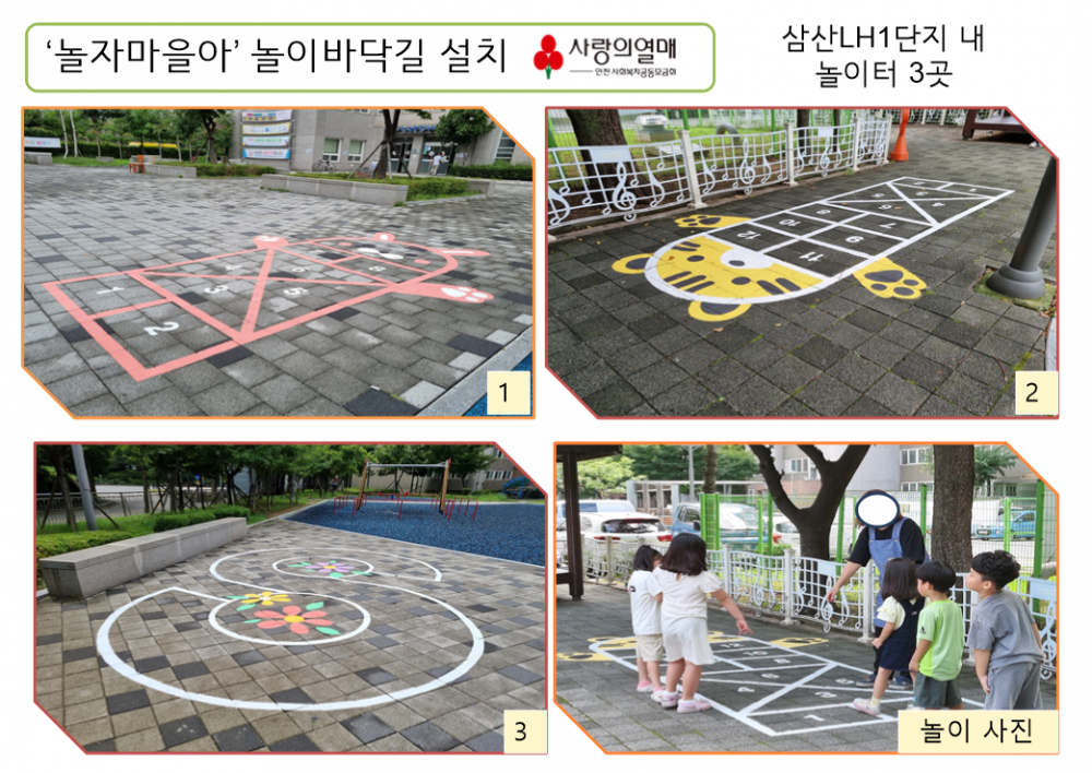 아이들의 놀 권리 증진을 위한 놀자마을아에서 복지관이 위치한 삼산LH1단지 아파트 내 놀이터 3곳에 놀이바닥길을 설치했습니다.