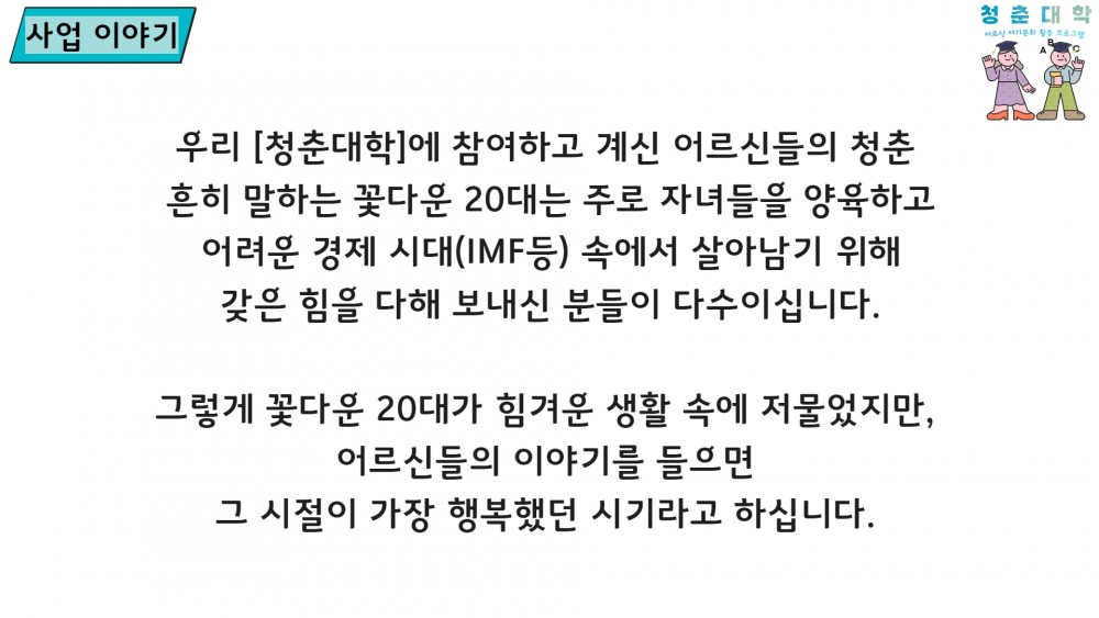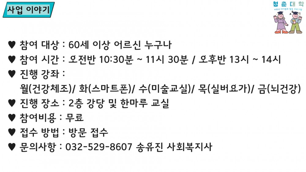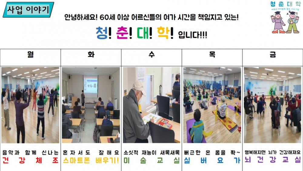 오늘이 가장 젊은날인 우리 어르신들의 하루를 더욱더 알차게 보내실 수 있도록!