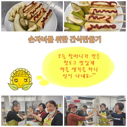 지역내 손자녀를 돌보고 있는 할머니 할아버지모임인 너나들이 모임에서는 손자녀를 위한 맛있는 간식만들기활동을 했어요