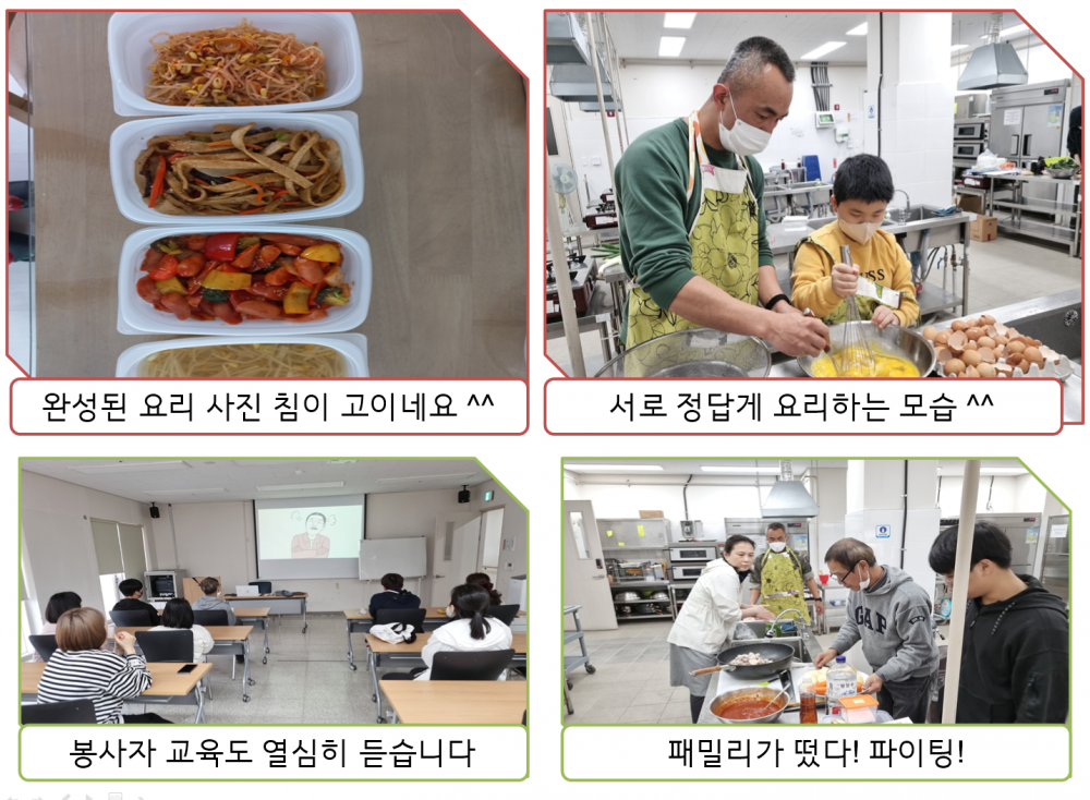 참고로 22년에는 코로나19로 인해 비대면 시대에 접어들면서 1월과 2월에는 가족봉사단이 각 가정에서 요리를 하고 이용자분들에게 전달하는 시스템이었다면 3월부터는 대면 봉사 방식으로 전면 개편되었습니다. 가족봉사단끼리도 서로 얼굴을 마주보면서 소통하면 요리 활동도 즐겁고 서로 다른 가족끼리 친해지면서 봉사의 동기부여가 확실히 높아짐을 느낍니다.