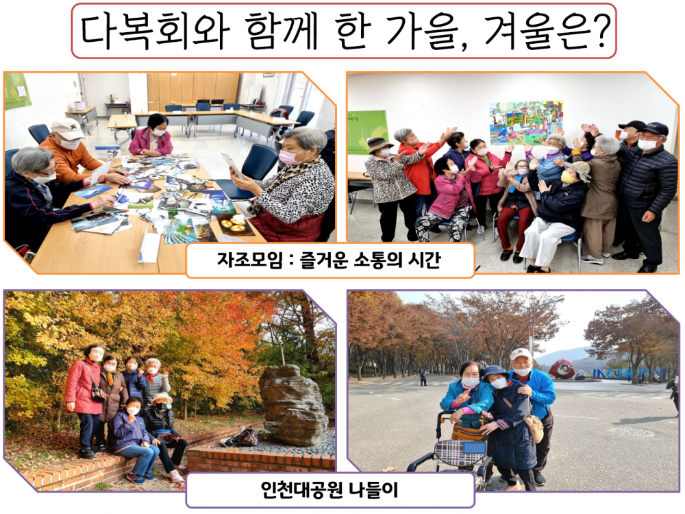 다복회는 후반부에 전 담당자의 공백으로 갑작스럽게 이어받은 프로그램이지만 어르신들과 짧은 3개월 동안 많은 추억을 나눌 수 있었습니다. 특히 15명의 참여자 모두가 출석 완료했을 때는 다복회가 걸어온 길이 얼마나 서로 끈끈하고 애정이 깊은가를 간접적으로 느낄 수 있었습니다.