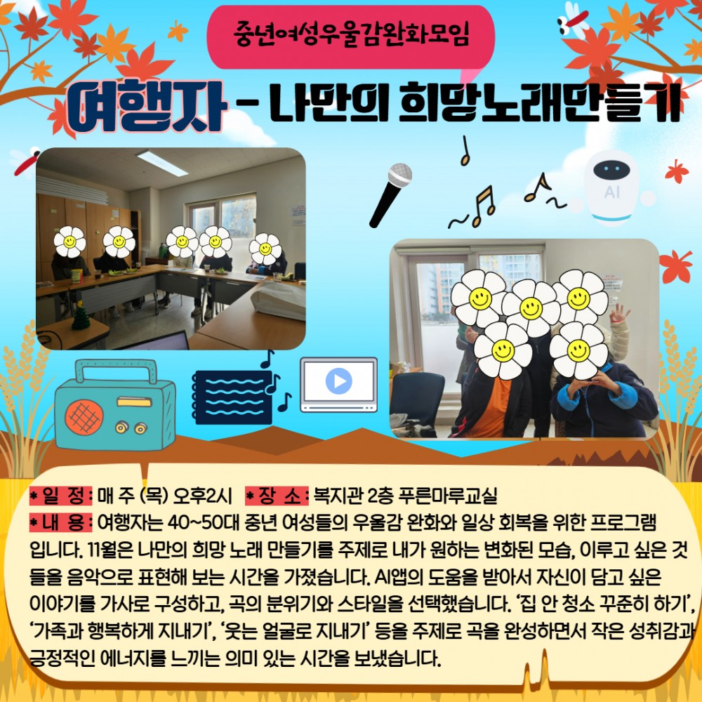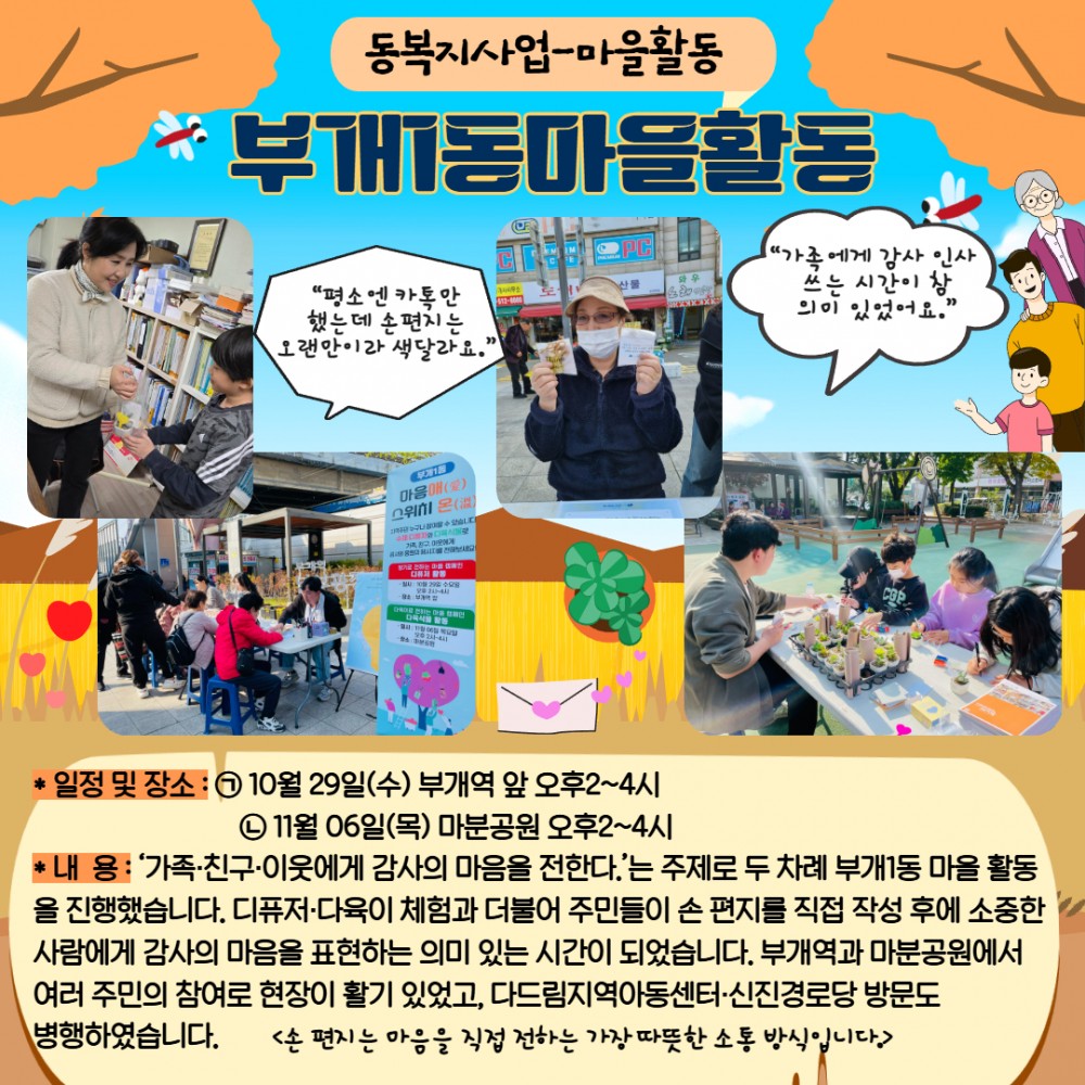11월 한 달 동안 복지관 곳곳에는 주민들의 따뜻한 참여와 웃음소리가 가득했습니다.