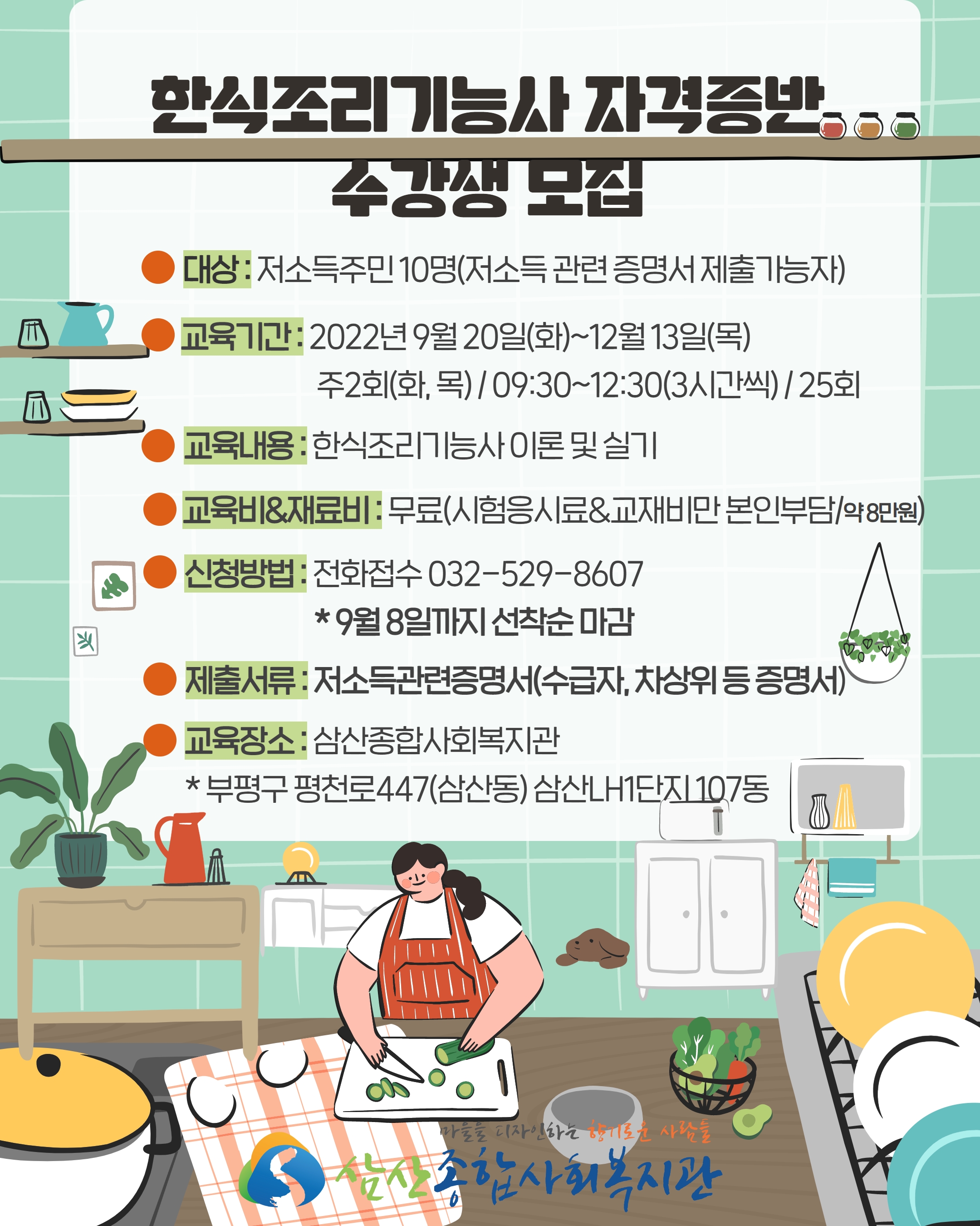 2022년 삼산종합사회복지관에는 한식조리기능사 자격증반이 새롭게 신설되어