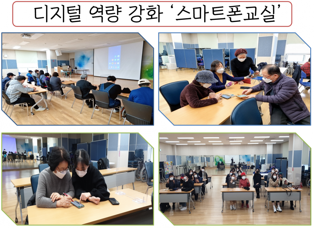 이를 해소하기 위해 2021년부터 복지관에서는 온라인 활용 기술이 취약했던 노인 대상 프로그램으로 청춘대학 안에서 스마트폰 교실을 신규 개설하여 지역 내 어르신들의 온라인 활용도를 높일 수 있도록 진행해왔다. 이에 따라 많은 참여자가 관심을 가져주셔서 신규 등록한 인원이 가장 많았으며 실인원 80명을 달성하였다. 진행 방식의 경우 강사님의 지도 교육 하에 자원봉사자가 1:1로 지원하는 방식을 채택하여 체계적인 운영이 가능하였다. 그리고 연간 진행해본 결과 실력이 향상되어 초급반에서 중급반으로 올라간 어르신도 생겼으며 QP 체크나 와이파이 설정, 키오스크와 같은 최근 변화된 사회 속에서 꼭 필요한 교육들이 다수 이뤄져서 어르신들의 디지털 역량 강화에 즉각적인 반응을 보였다는 평을 받고 있다.