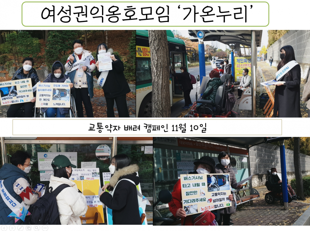 ▶ 삼산종합사회복지관에서 여성장애인들로 구성된 권익옹호 모임“가온누리”를 통해 11월 10일 교통약자 배려 캠페인을 진행하였다.
