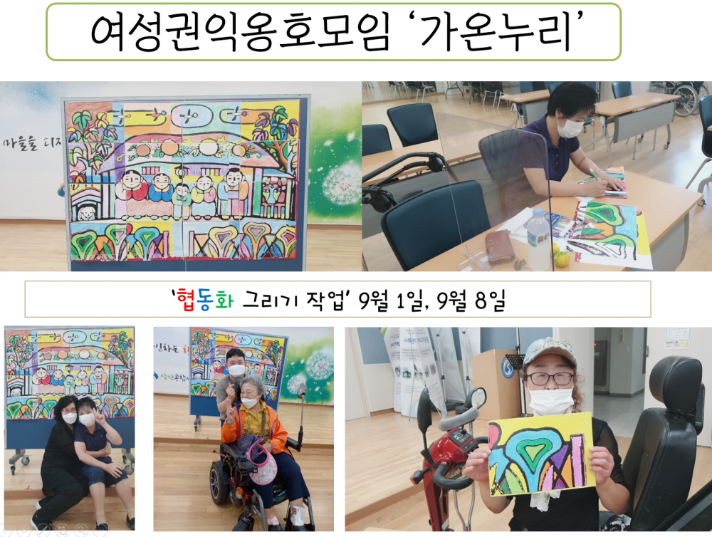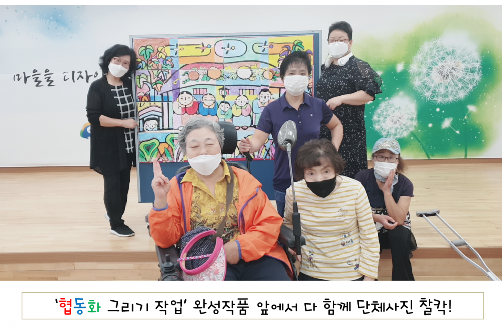 내용 : 가온누리 여성 장애인분들이 그림으로 똘똘 뭉쳤습니다. 코로나로 만나지 못하는 요즘 화합을 유도하고자 각자 그림을 따로 그린 뒤 합치는 작업을 진행하였습니다. 일명 협동화!