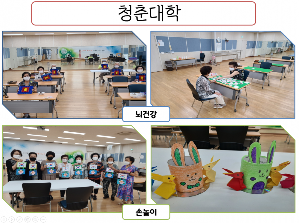 내용 : 코로나로 많은 어르신들이 참여하지 못하시고 2차 백신 맞고 2주 지난 분들만 따로 진행하였습니다. 얼른 다 함께 웃으면서 청춘대학을 즐기는 날이 돌아왔으면 좋겠습니다.