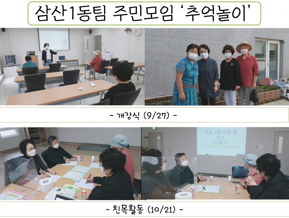 저희 삼산1동팀 ‘추억놀이’는 회원들 각자의 재능을 기반으로 다양한 활동을 진행하고 주민들 간의 유대감을 쌓기 위한 주민 모임입니다. 코로나19로 인한 우울감이 높아진 요즘 즐겁게 활동하고자 주민들을 모집했는데요.