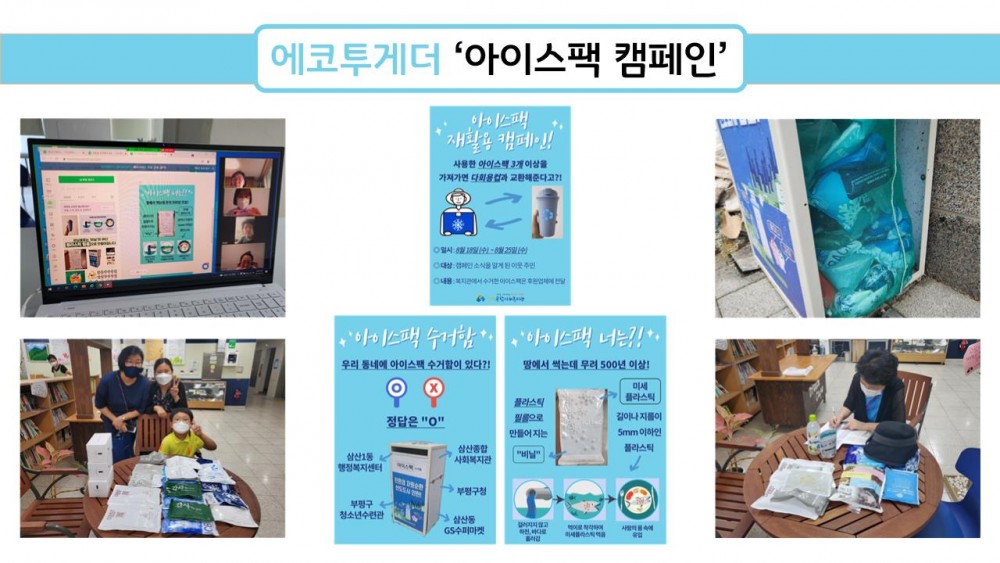 6월엔 지역 주민들에게 환경 문제를 알리고 환경을 위한 실천을 독려하기 위해 복지관 앞에서 아이스팩 재사용 캠페인을 실천하였습니다. 초등학생, 주부, 어르신 등 다양한 연령대의 주민들이 참여하여 아이스팩이 환경에 미치는 유해성을 알게 되었고, 분리배출 게임을 통해 분리배출이 애매한 쓰레기들의 올바른 분리배출 방법도 배워갈 수 있었습니다. 8월달에도 같은 캠페인을 계획하였으나, 사회적 거리두기가 4단계로 격상되어 다수가 모이는 캠페인 진행이 어렵게 되었습니다. 이에 8월엔 각자의 이웃에게 캠페인을 진행하기로 계획하였고, ZOOM을 통해 온라인으로 모여 홍보지를 만들고 개별적으로 캠페인을 실천하였습니다.