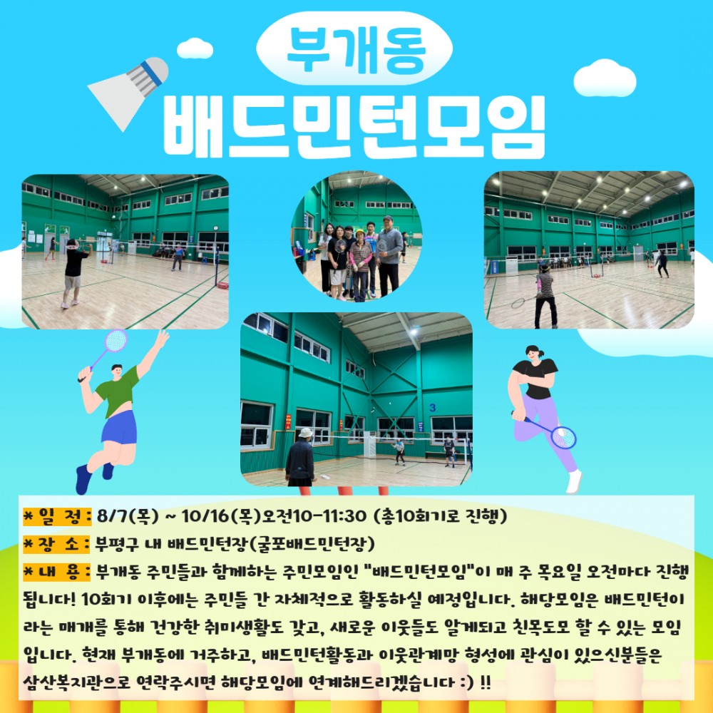 * 내 용 : 부개동 주민들과 함께하는 주민모임인 "배드민턴모임"이 매 주 목요일 오전마다 진행됩니다!
