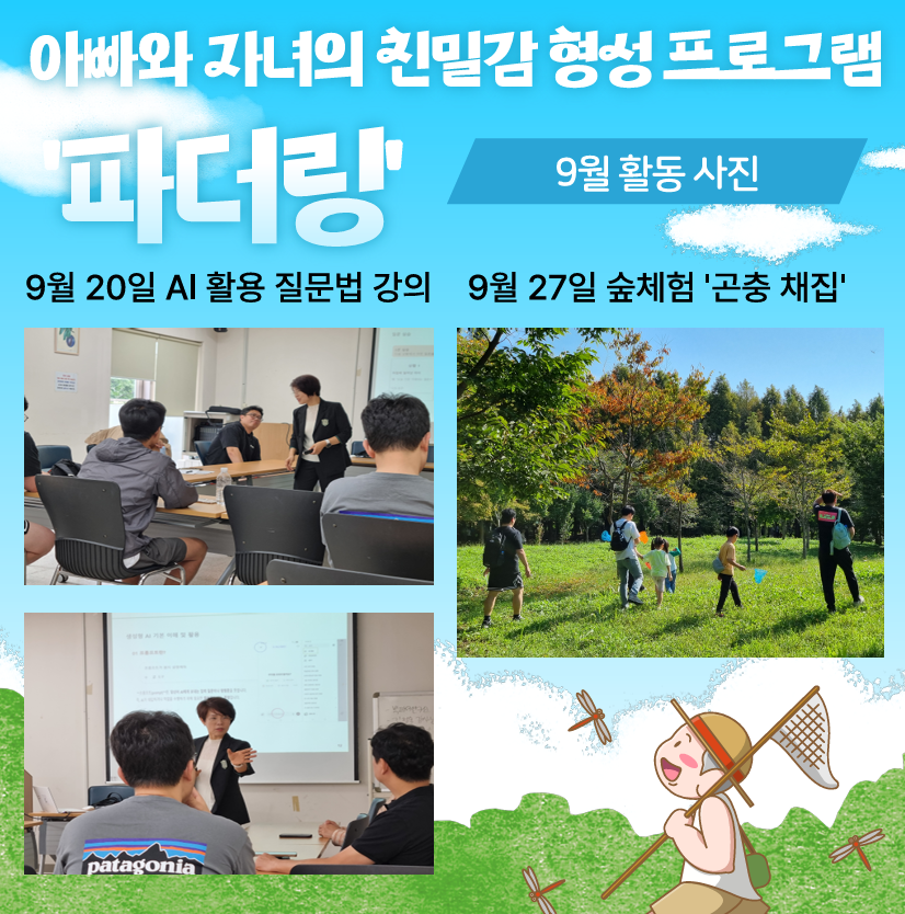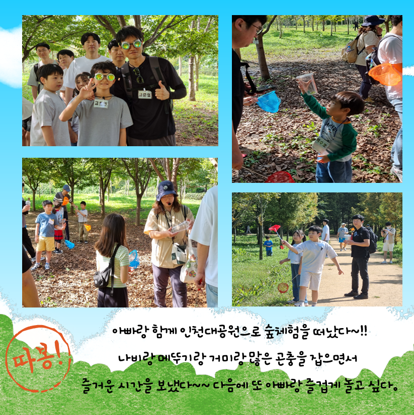 내용 : 가족 간의 관계망 형성에 좀 더 초점을 맞추고자 아빠랑 자녀가 함께하는 곤충 채집으로 테마를 구성함. 모든 아이들이 곤충 채집에 강한 흥미를 느꼈고 아빠랑 이곳저곳 돌아다니고 함께 잡으면서 도전과 탐험의 경험을 공유할 수 있었던 점이 인상적이었음. 아버지들은 활동 속에서 자녀의 호기심과 성취를 긍정적으로 바라보았고, 자녀들 또한 아버지와 함께하는 자연 체험에서 즐거움과 힐링을 경험한 것으로 보임. 특히 곤충을 직접 관찰·채집하며 교육적 요소와 놀이적 요소가 자연스럽게 어우러져 관계 형성에 효과적이었음. 참여자 반응으로는 아이들이 너무 좋아하니까 아버지들의 만족도도 매우 높았음.