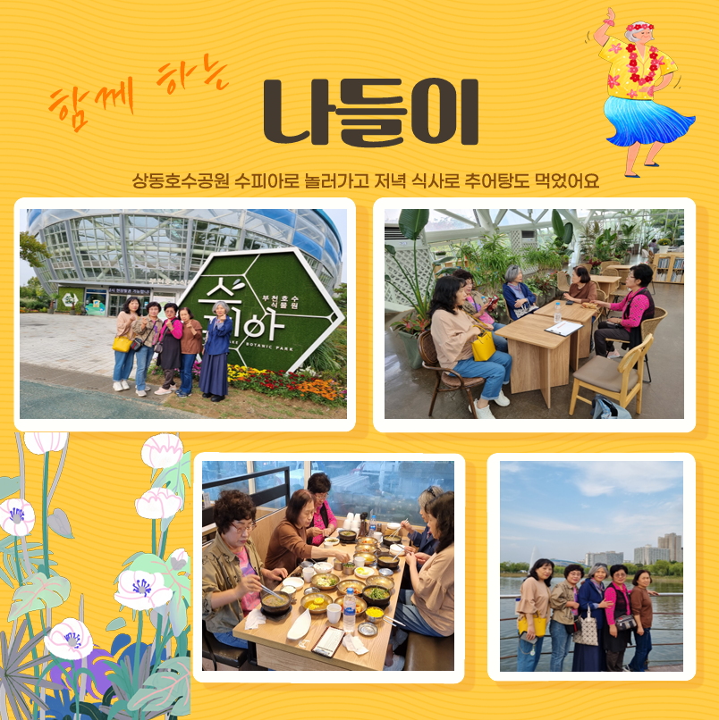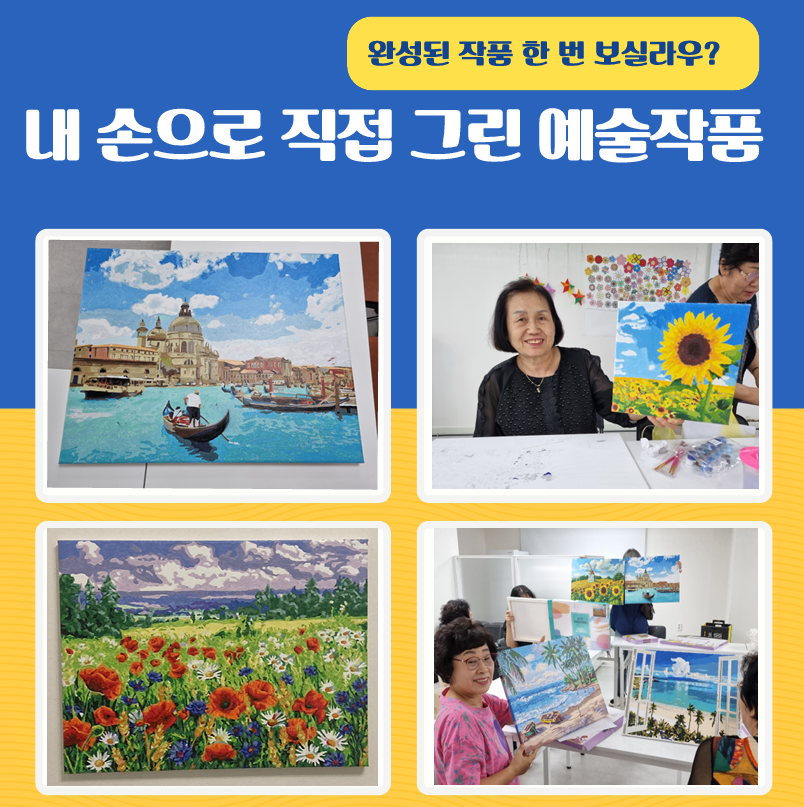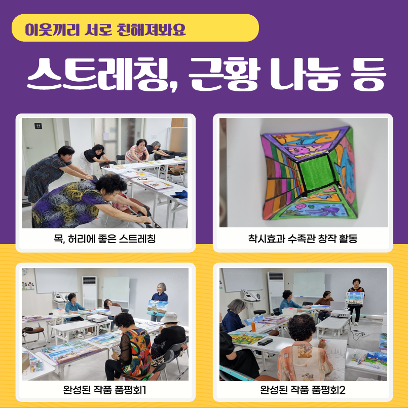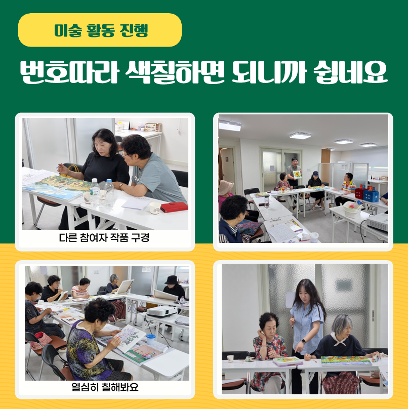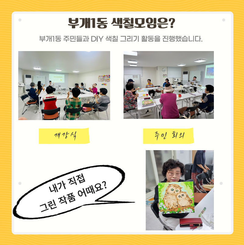 내용 : 색칠 모임은 단순한 취미 활동을 넘어 참여자들에게 새로운 도전과 성취감을 제공한 프로그램이었음. 처음에는 주민들이 과연 모일 수 있을까, 또 그림을 완성할 수 있을까 하는 우려가 있었지만, 실제로는 기대를 훨씬 넘어서는 성과가 있었음.