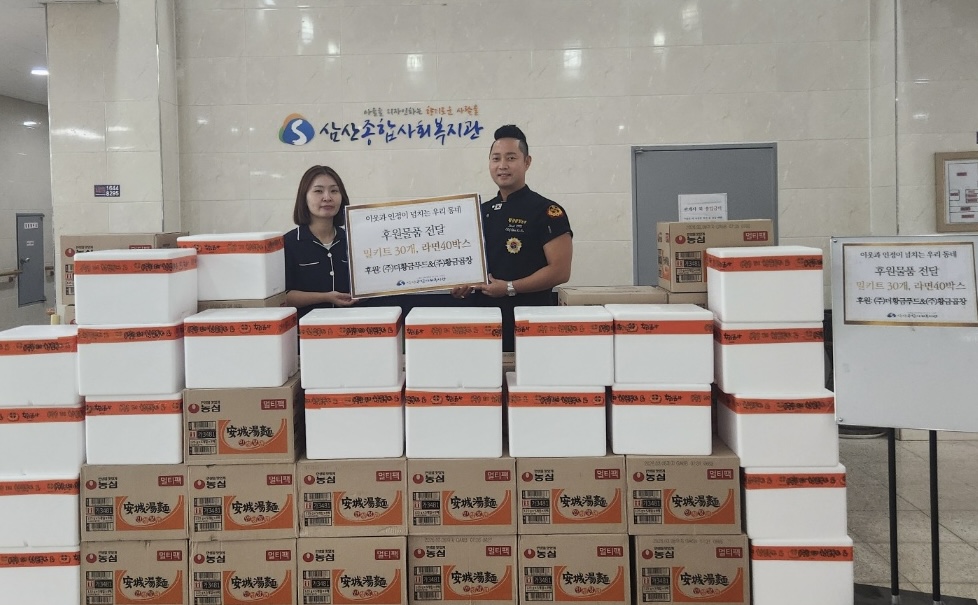 [ '(주)더황금푸드&(더)황금곱창 후원물품 기탁 : 밀키트(곱창전골) 30개, 라면40박스 후원 ]