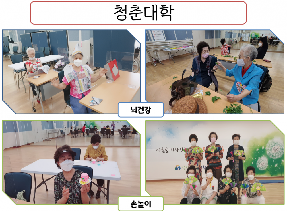 7월 즈음 코로나가 4단계로 격상되면서 복지관에 다시 한 번 큰 변동이 찾아왔습니다. 어르신들의 건강을 염려하여 급하게 스마트폰과 문화감상은 중단되었고 손놀이와 뇌건강도 인원 재조정을 하였습니다. 2차 백신까지 맞은 어르신에 한하여 10명 이하로 진행하다 보니 예전만큼의 흥겨웠던 분위기도 사라지고 참여를 못하게 된 어르신들의 아쉬움이 계속 커져만 갔습니다. 그럼에도 불구하고 청춘대학은 꾸준히 어르신들의 행복한 노후 생활을 위해 다양한 방법은 고민해보고 소통해나가겠습니다.