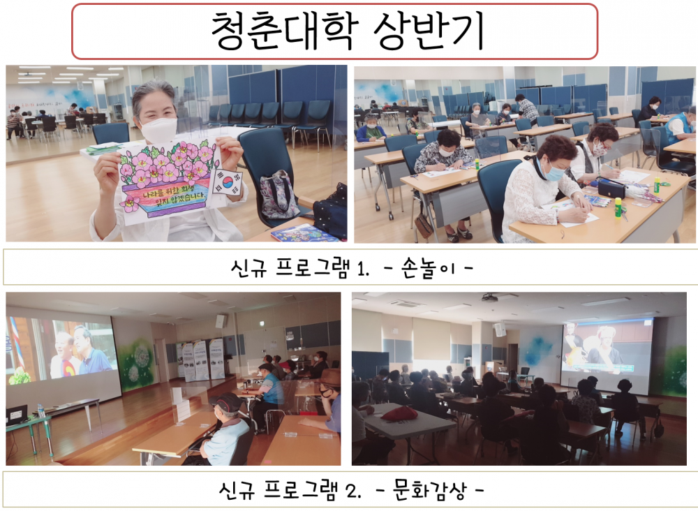 내용 : 6월에도 어르신들의 청춘대학은 정신없이 흘러갔습니다. 기존의 ‘스마트폰’과 ‘뇌건강교실’ 외에도 새롭게 ‘손놀이’와 ‘문화감상’이 추가되었는데요.
