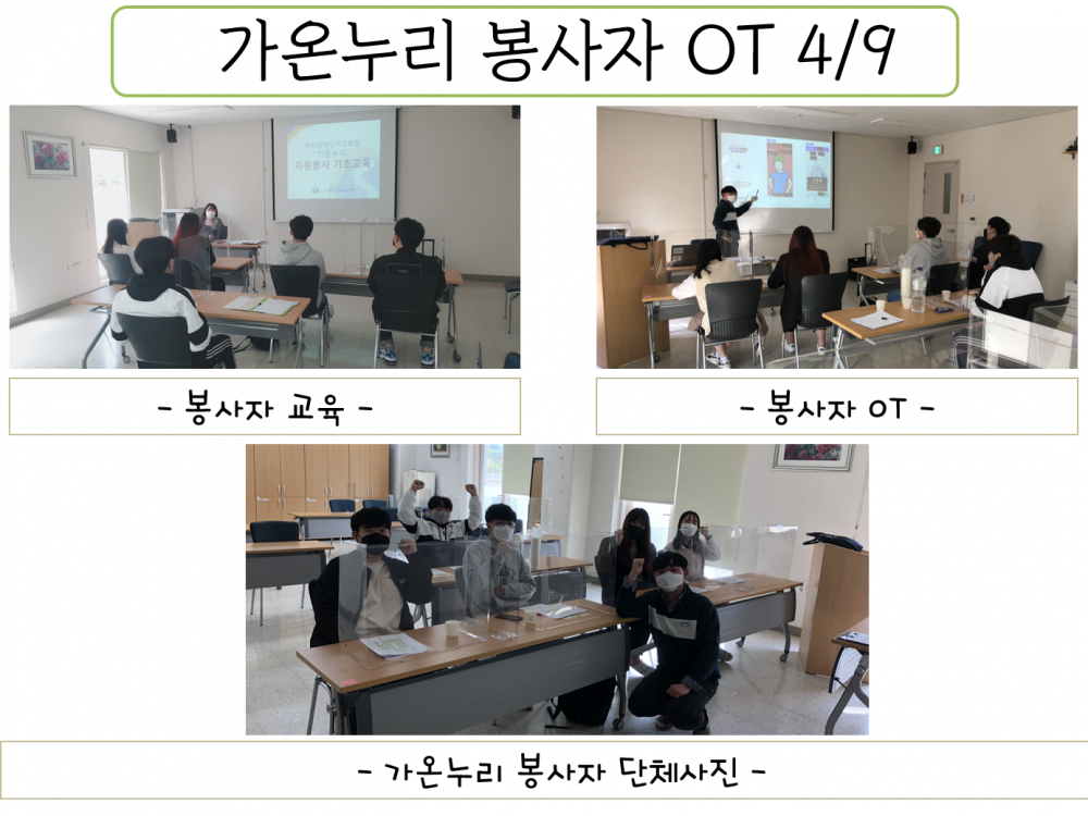 - 내용 : 가온누리 권익옹호실천을 돕기 위한 봉사자들과의 첫만남이 이뤄졌습니다. 젊은 대학생 5명이 참여하게 되었는데요. 봉사자 기초교육을 받고 가온누리 활동 내용 및 일정을 공유하면서 봉사의지를 다질 수 있었던 소중한 시간이었습니다.
