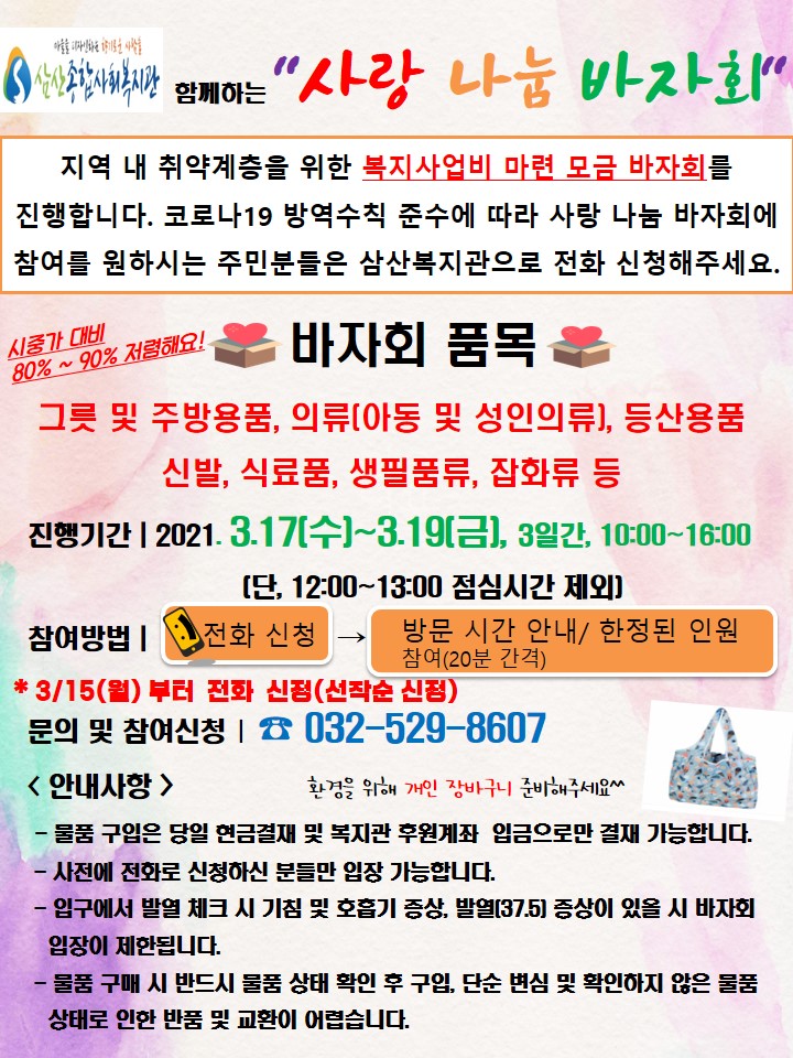 사랑 나눔 바자회에 참여를 원하시는 주민분들은 삼산복지관으로 전화 신청해주세요!!