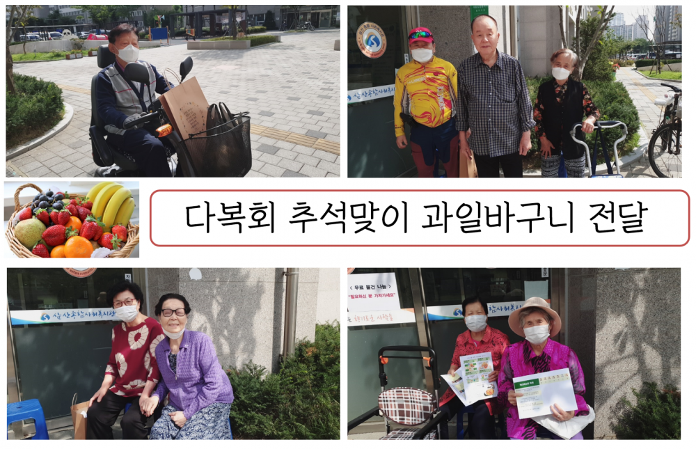 · 내용 : 추석을 맞아 독거 어르신 자조 모임 다복회에서는 과일바구니를 전달하였습니다. 이번 추석 연휴가 긴 만큼 저희 삼산종합사회복지관에서 나눠드리는 과일 드시고 비타민 듬뿍 챙겨 드셨으면 좋겠습니다. 그 밖에 다복회 회원간에 연락을 주고 받고 건강 챙기시라는 의미에서 비상연락망과 건강정보가 담긴 정보지를 함께 나눠드렸습니다. 코로나19로 활동 범위가 줄어든 어르신들을 위해 앞으로도 꾸준한 활동을 유도하여 우울감 감소 및 활동반경을 넓혀 드리고자 합니다.