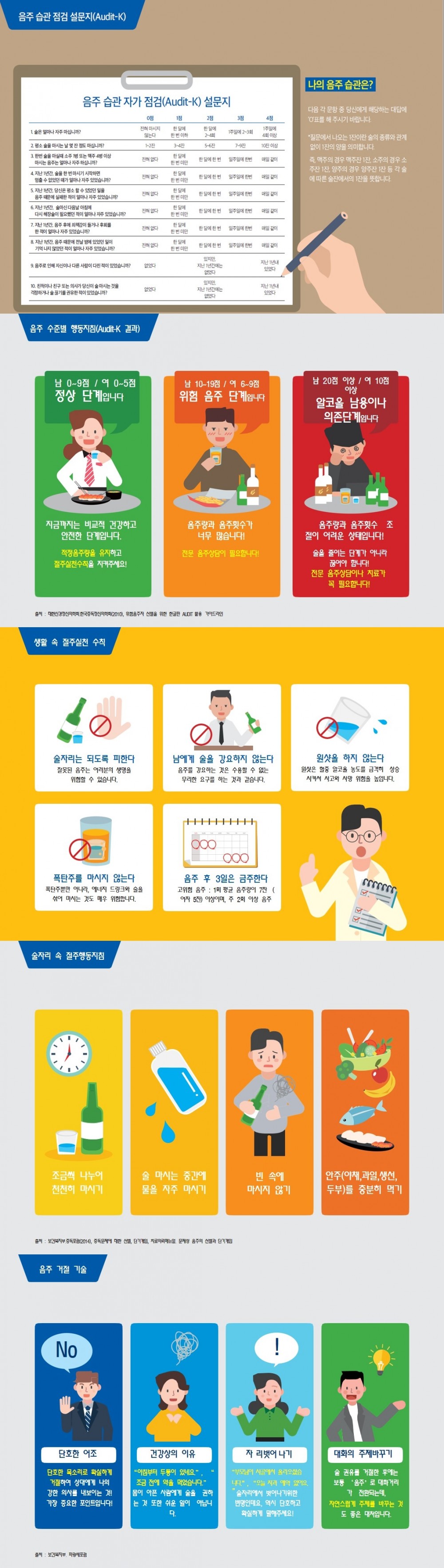 절주실천수칙과 음주거절기술 등 실생활에서 술을 줄이기 위해 어떻게 해야 하는지 알아보는