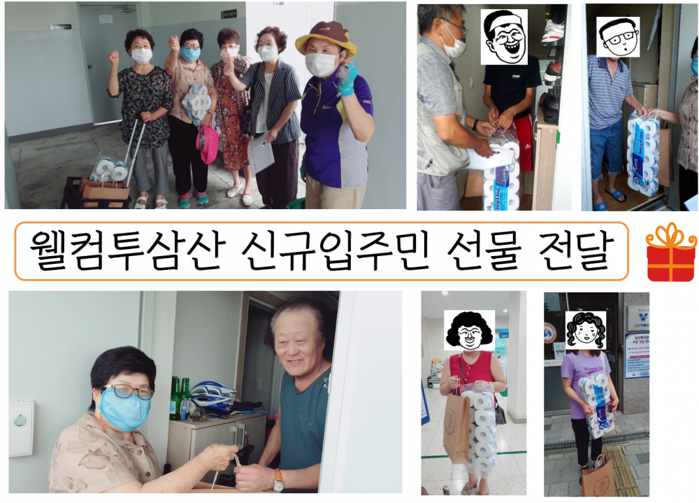 · 내용 : 코로나로 정신없는 요즘 신규 입주민 분들을 환영해드리고자 다양한 선물을 준비했습니다. 생필품과 환영인사문으로 구성된 선물을 들고 각 신규입주민 댁에 방문해 전달해드렸는데 모두가 만족해하시며 고맙다는 인사를 전해 오셨습니다.