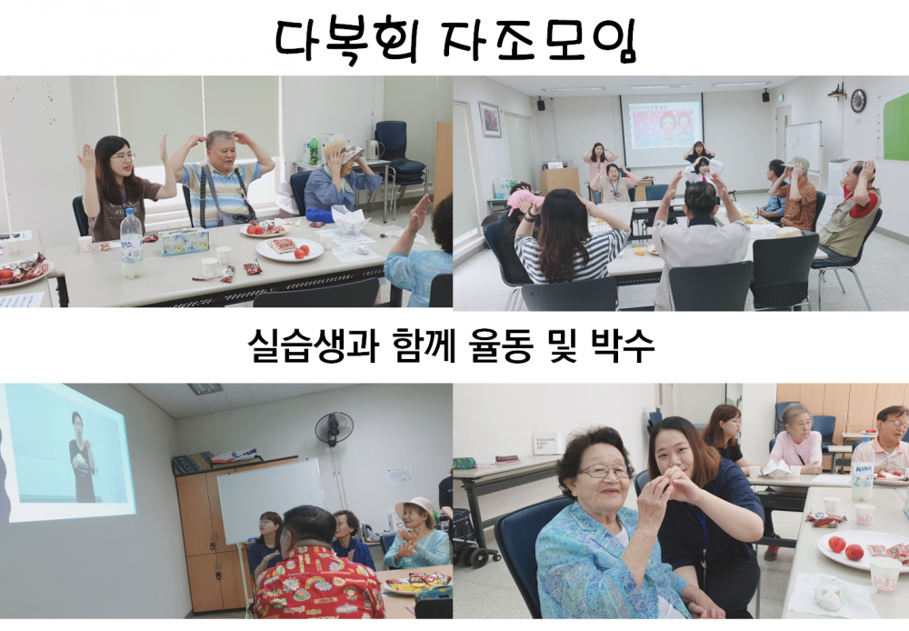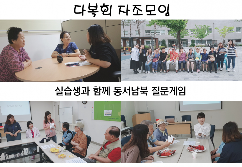 내용 : 다복회 어르신들과 함께 어울리고자 사회복지사를 꿈꾸는 실습생들이 뭉쳤습니다. 평소 어르신들과 접할 기회가 많이 없었던 만큼 더욱 열정적으로 준비를 하였는데요.