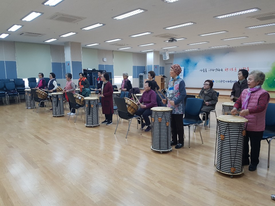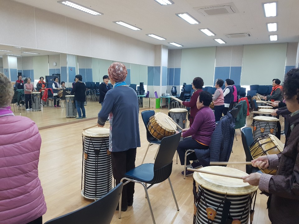어르신들이 신나는 음악에 맞춰 북을 두드리며 스트레스 날려버리는 난타교실입니다.